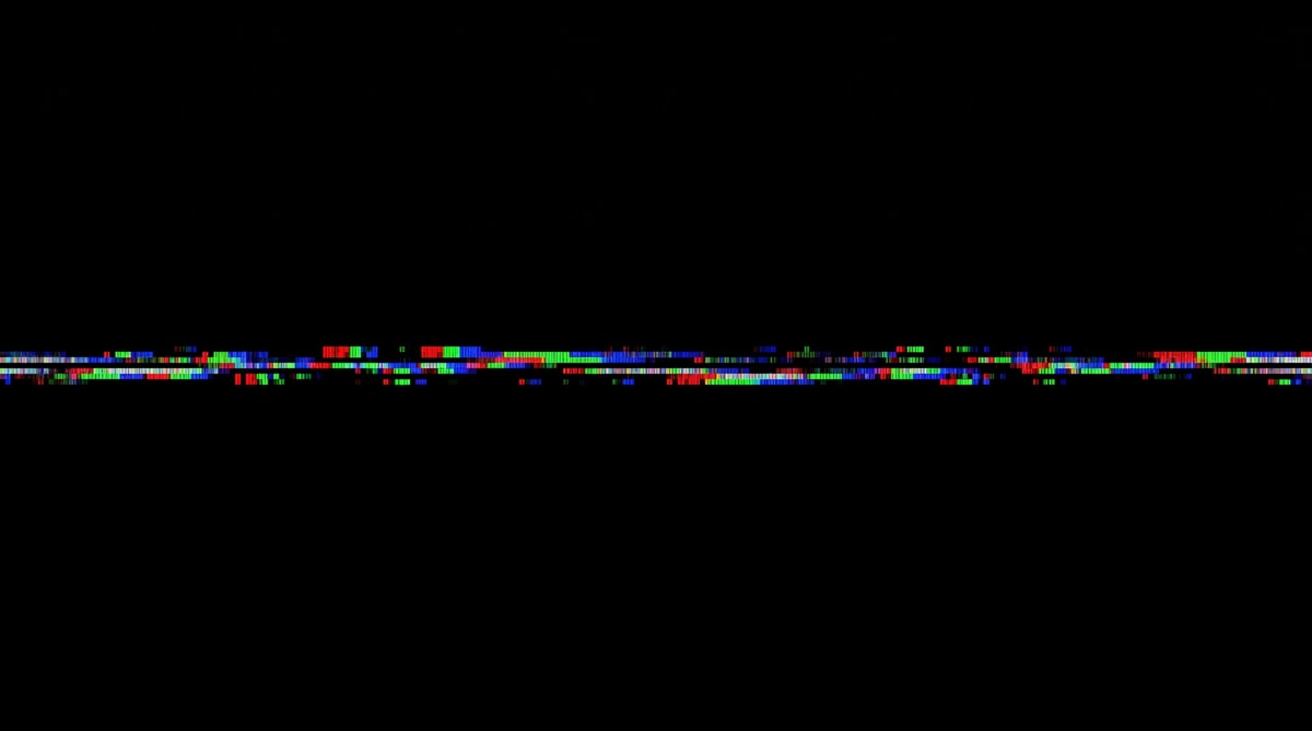 This 4K texture features a dense horizontal line of digital glitch artifacts. It displays distinct red, green, and blue block distortions, resembling corrupted data streams or signal interference on a black background.