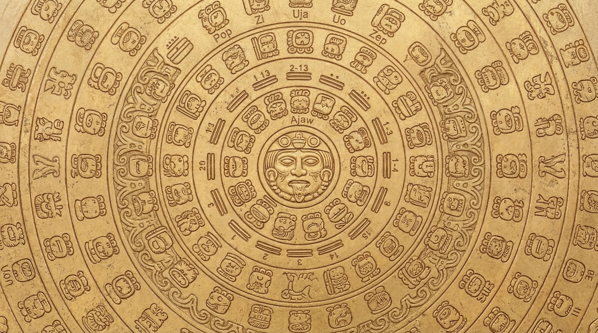 This 4K texture showcases an intricate Mayan calendar design meticulously carved into aged gold. The surface exhibits detailed glyphs and numerical markers, suggesting historical or ceremonial significance.