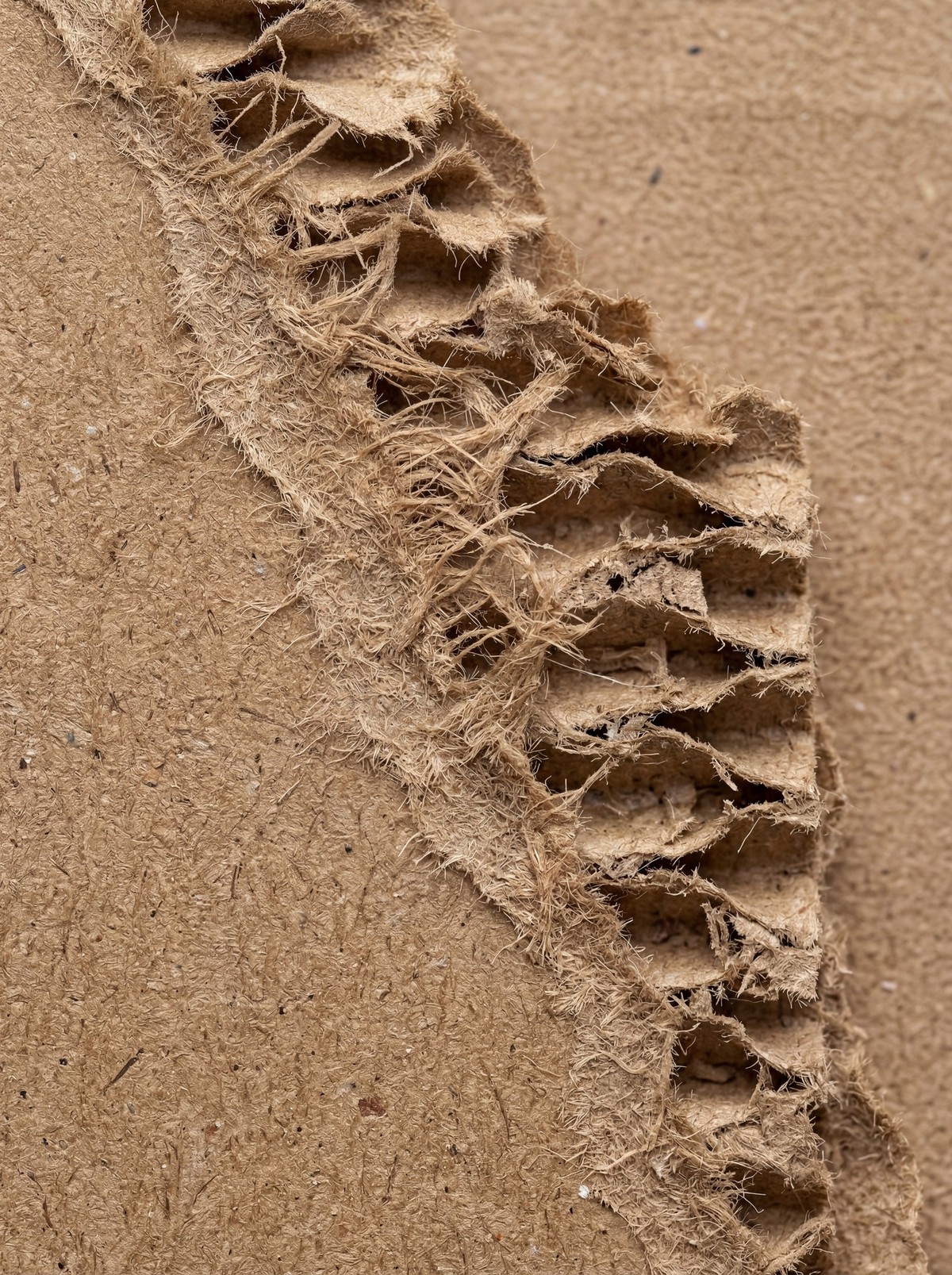 This 4K texture showcases the raw, torn edge of corrugated cardboard. The surface features visible layers of paper with a honeycomb-like internal structure, detailed with fibrous, frayed edges and a natural, muted brown hue.