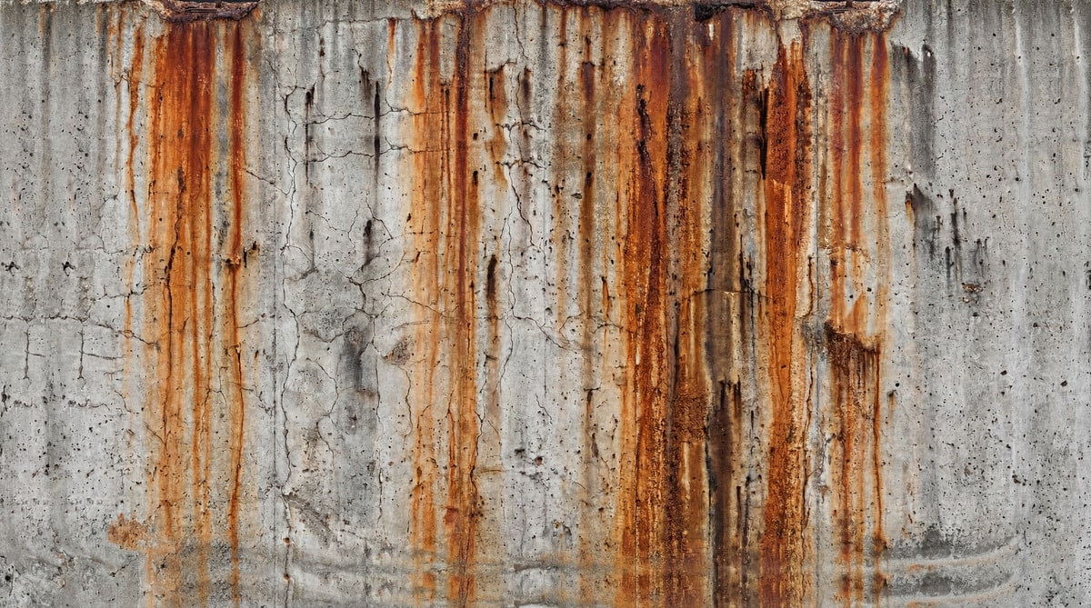 This 4K texture showcases a raw, brutalist concrete surface exhibiting significant wear. Prominent vertical rust stains cascade down the material, indicating water runoff and iron leaching, creating a distressed and aged aesthetic.