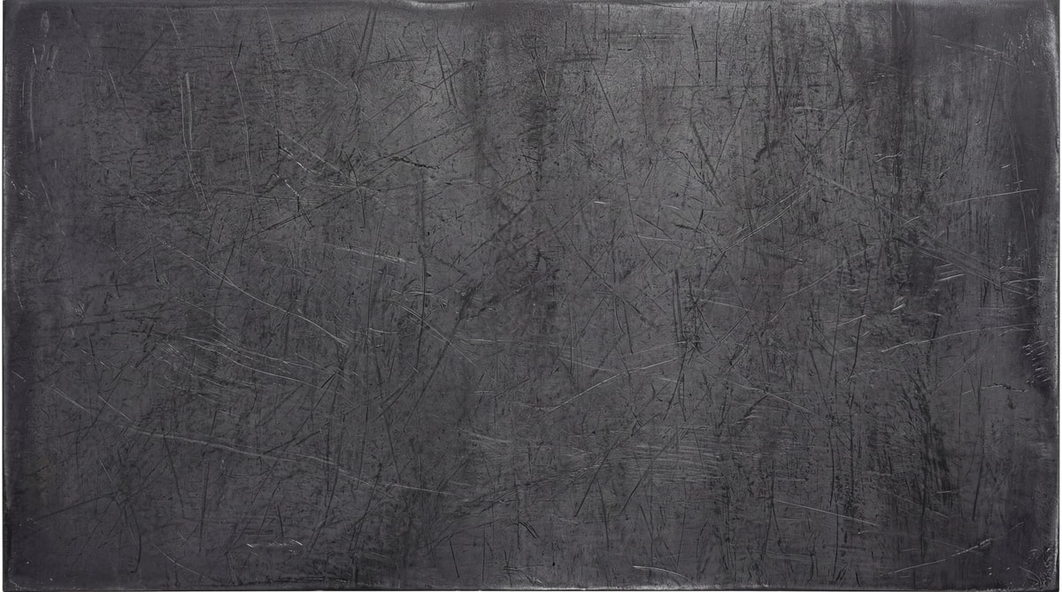 A dark, raw steel surface featuring heavy linear scratches and industrial wear across the entire metallic texture.