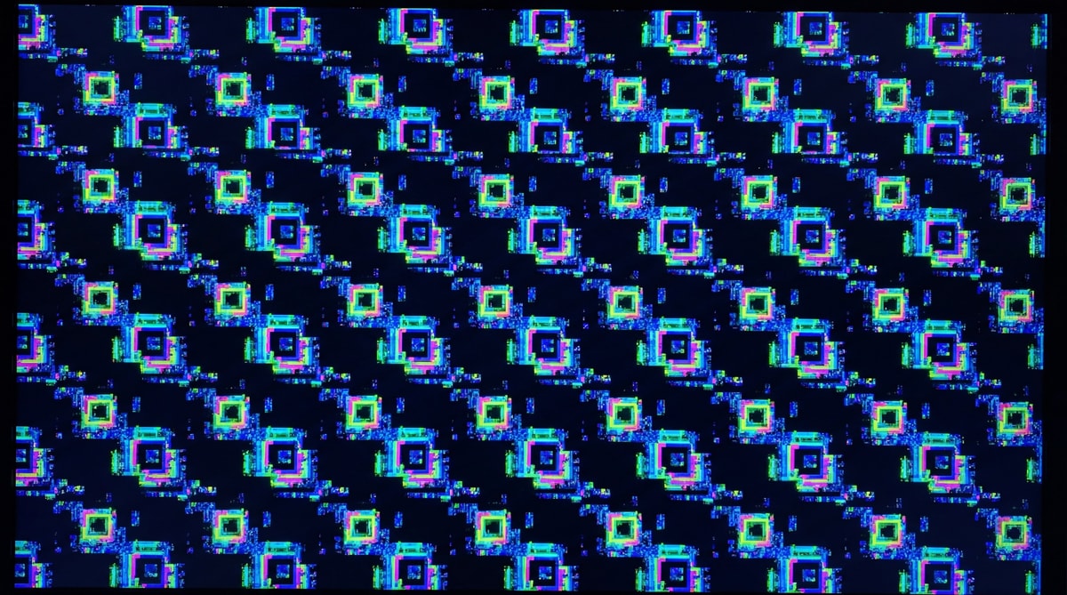 A chaotic overlay of vibrant, pixelated squares in blue, green, and pink, resembling a GPU kernel panic screen.